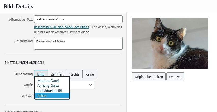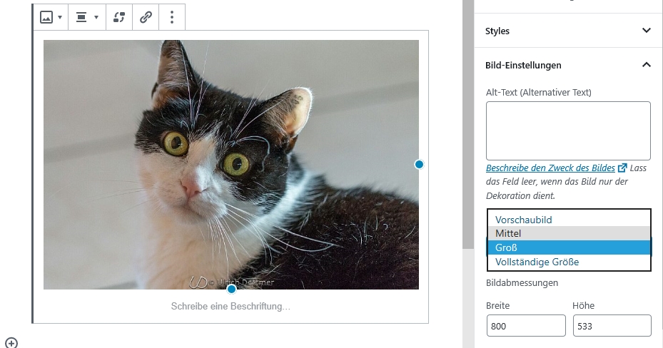 Bilder und Fotos werden grundsätzlich in der Originalgröße hochgeladen, egal in welcher Größe sie gebraucht werden. Früher wurden die Bilder immer in der Originalgröße zum Browser ausgeliefert, mit den gewünschten Angaben für Breite und Höhe. Der Browser musste dann das Bild vor der Anzeige erst auf die angegebene Größe skalieren. Neben der dafür erforderlichen Rechenleistung auf dem PC fiel die Übertragungsdauer ins Gewicht, die eine zu große Datei erforderte. Mittlerweile erstellt WordPress der Originaldatei noch zusätzliche Dateien in den Größen
