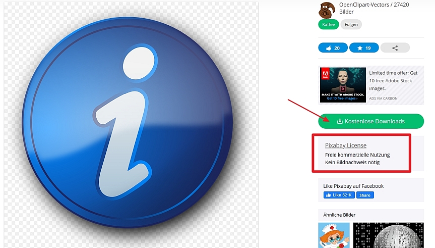 Auf der Seite pixabay gibt es eine Vielzahl an Bilder und Fotos zum freien Gebrauch. Achten muss man allerdings auf die genaue Ausprägung der Lizenz. Bei manchen Medien ist eine Nennung des Urhebers erforderlich. Will man das vermeiden, muss man ggf. ein anderes Bild wählen. Da wir einen transparenten Hintergrund brauche, ist es wichtig, als Bildformat “png” zu wählen. Als Download-Größe reicht hier die kleinste Größe, da wir das Bild ohnehin noch verkleinern müssen.